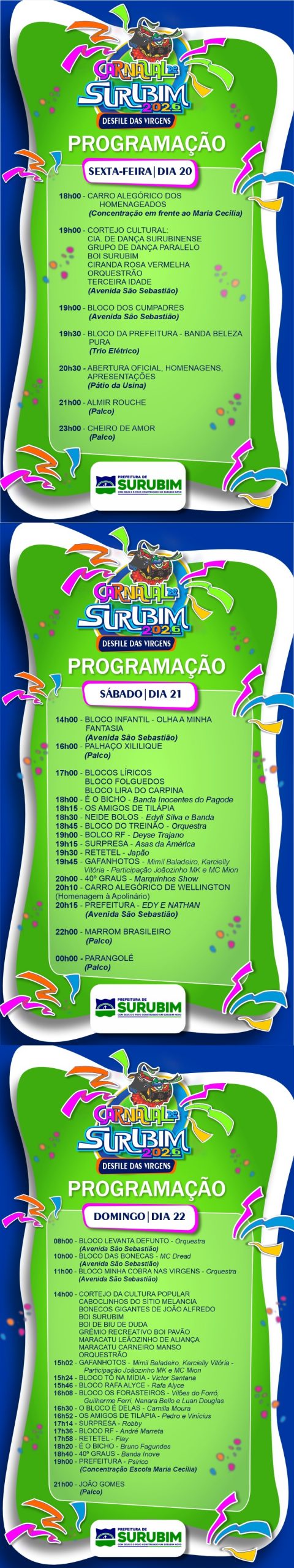 A Prefeitura de Surubim divulgou a programação completa do Carnaval 2026, que acontece entre os dias 20 e 22 de fevereiro, mais conhecido como o Desfile das Virgens. A festa promete movimentar a cidade com uma mistura de cultura popular, blocos carnavalescos, cortejos culturais e grandes atrações musicais no palco montado no Pátio da Usina.